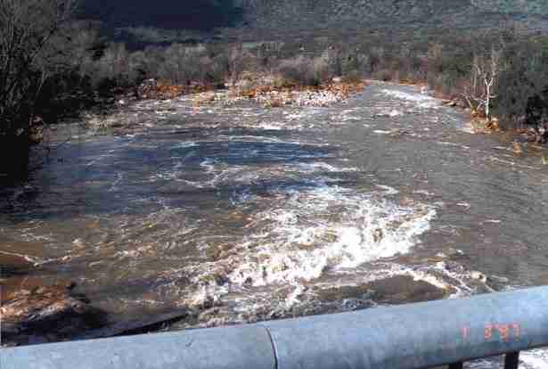 Looking downstream from the Dinely Drive bridge. No gage in site! (The gauge is usually on the bridge footing just visible on the left. Gauge height estimated at greater than 6 feet!