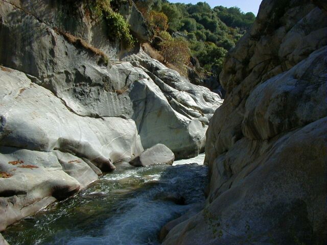 This run is longer than the one above, slightly less difficult and contains two very high gradient sections as well as a very long and difficult possible portage around the difficult waterfall and gorge below the Park Headquarters at Ash Mountain. Between the major major drops there is a surprising amount of the river that can be run by boat scouting or easy scouting from the bank. Everything is easily portable with the exception of the Gorge. High above on the right the road is never far away but the bank is steep and there is mega poison oak. This section is also sometimes refered to as The Hospital Rock Section by those who don't descriminate between the two sections. Very seldom is this run attempted in combination with the real Hospital Rock Section due to the high overhead and long day that results.