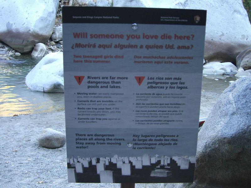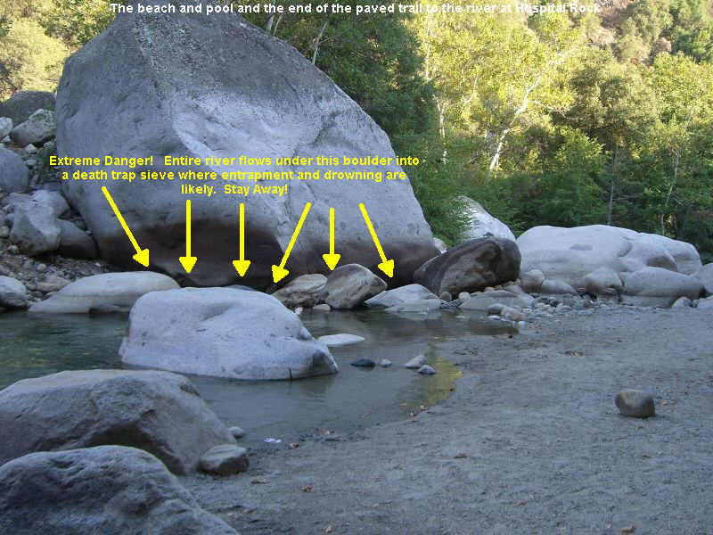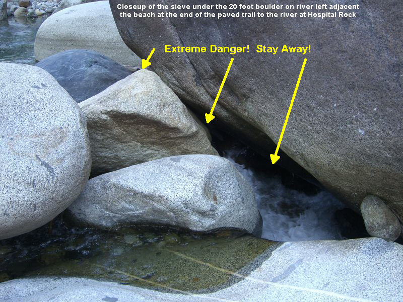 • 09-13-09 Two drownings occurred this summer on the Kaweah. Such a tragic but avoidable loss of life. The drwonings occurred on successive days and both in the same spot adjacent the beach at the end of the paved trail to the river at Hospital Rock. The site is sometimes referred to as the "Toilet Boil", and for good reason as the entire river flows under a twenty foot high boulder on river left into a near perfect death trap sieve. Kayakers putting in here for the Hospital Rock run or finishing the Buckeye Flat section avoid this spot like the plague as it is obviously a place you don't want any part of. Portaging or putting in below the hazard is the only thing to do here. Here are a few pictures of the hazard taken at slightly less flow than when the accidents occurred but by no means a lesser hazard at this lower flow. Moving water generates very high forces and this spot is a hazard at any flow level. Swimmers, please stay away at at times!