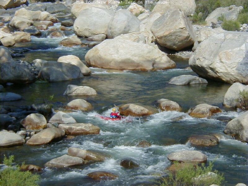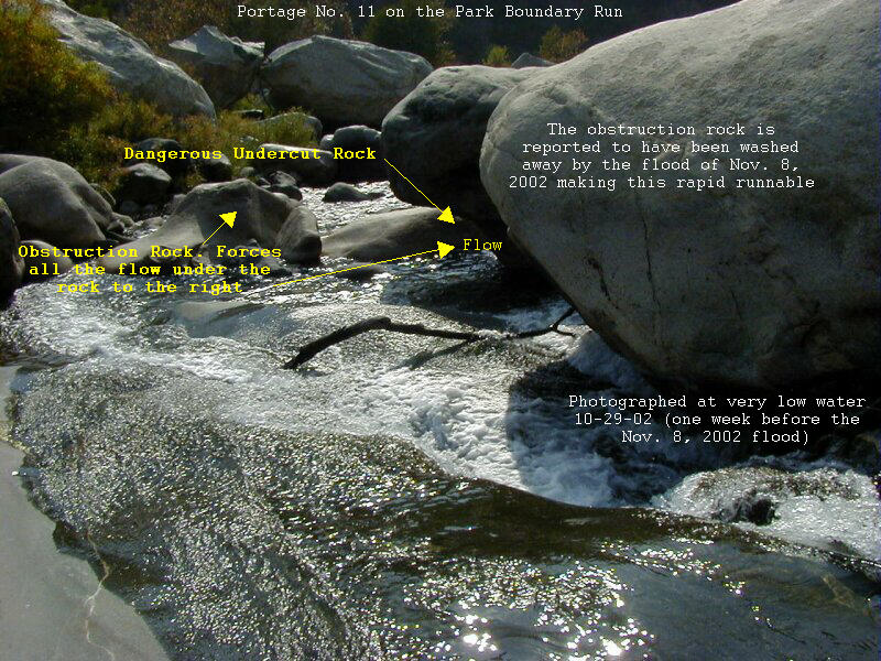 • 04-01-03 Alan and Mike ran the Park Boundary on 3-22-03. They report some good news! Portage No. 11 is no longer a portage. The boulder that blocked the bottom of the drop forcing the flow under the dangerous undercut boulder on the right is gone as a result of the Nov. 8, 2002 flood. The new rapid is a large sliding drop. The gauge on the Boundary read 4.90 ft. (est 225 cfs on the Boundary). Flow at Three Rivers was 650 cfs at the time and flow was reported as minimal for the upper Kaweah. The bottom left exit of Osterizer is reported to have changed also. The fang tooth rock at the bottom is gone.