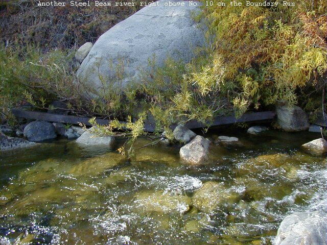 • 11-01-02 More Steel beams in the river up on the Boundary. These beams were documented in late Oct. 2002. Photos 1 , 2 , 3 , 4 , and 5 . All this steel in the river is probably compliments of Southern California Edison Company. There ought to be a law, If you lose your bridge then you got to find and remove all the pieces from the river at no matter what the cost. There are at least another dozen known major pieces of steel in the river in the mile below Pumpkin Hollow Bridge. Not to mention the reminents of bridges destroyed in the 1955 flood.