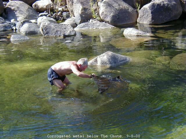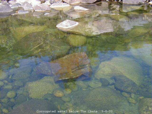 • 09-11-00 A large and ugly piece of a metal building was recently removed from the river below the Chute. The metal appeared after the Jan. 1997 flood. We know it's a metal building because the padlock is still on the door. Removing the metal: Image 1 , Image 2 , Image 3 , Image 4 .