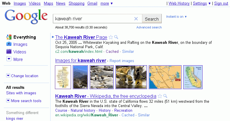 • 12-01-10 If you Google for Kaweah River you might find that The Kaweah River Page is Number One in Google. This has been the case on and off for many years. No special methods have ever been used to try and improve the ranking of this page in any serch engine.