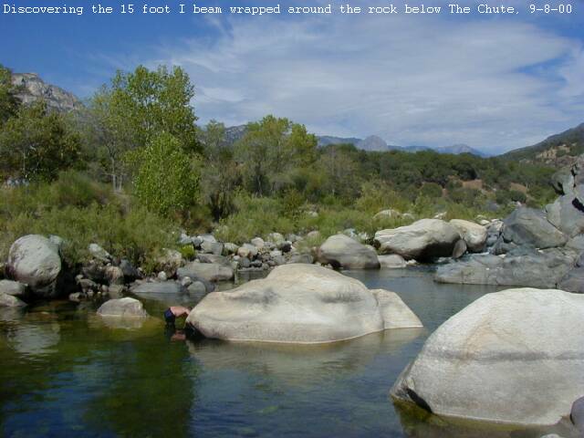 • 09-11-00 A 15 foot I-beam is wrapped around a large boulder just below the Chute. Prior to the flood of Jan. 1997 the I-beam was stuck in the mega boulders to the right of the main drop at The Chute. We now boat right over the top of this piece of steel. It is firmly stuck about 3 feet below the low water line and wrapped in a "friendly manner" around the undercut rock if you can call steel beams in the river friendly. It going to be a big project to get this out someday. Any Volunteers? Inpecting the I-beam