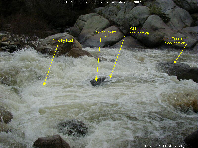 • 05-01-02 Old but good news. The Janet Reno Piton Rock in Powerhouse has moved downstream 15 feet to a safe and stable position nearly in the pool below. The center channel is safe (but still knarly) to run again. The rock has repositioned itself with both favorable location and angle. Rafters report the rock is still in the way but not as bad as before. There is more room for a raft to the left side of the rock. The void created by the rocks movement has created a new hydraulic with another surprize rock below the main pourover. The webmaster has personally T-boned this hidden underwater obstruction more than once even at higher flows of 1.4 ft. Avoid the T-Bone by staying right. See Photo.