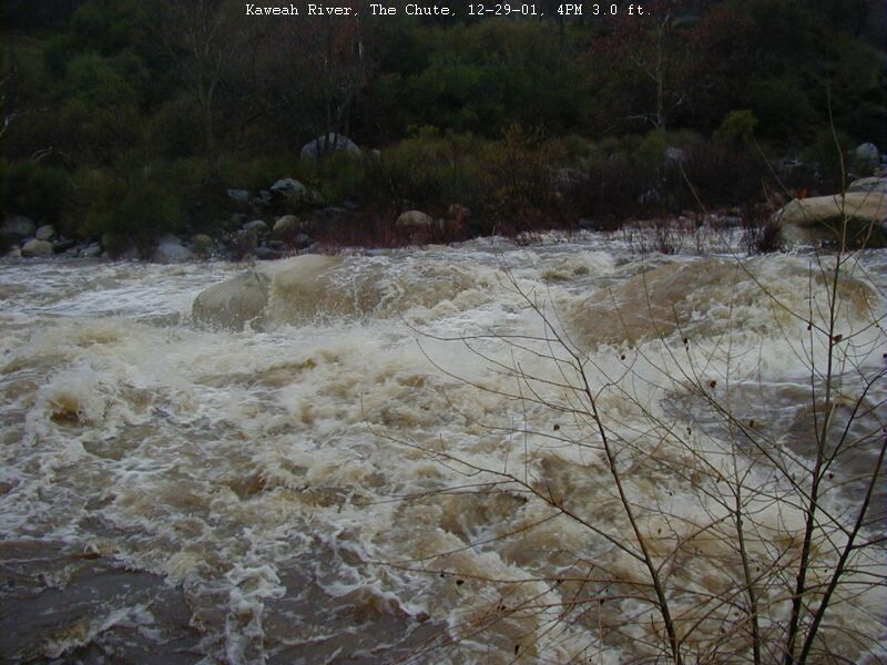 • 12-29-01 Aaron Root and his buddies rafted the Kaweah at high water on 12-29-02 . By the next day the flow was down and Alan Parker and myself ran from Gateway all the way into the lake bottom through the seldom run Wavetrain one quarter mile below Lower Holiday .