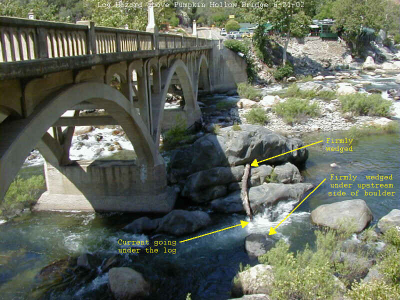 • 06-22-02 Remember the Log Hazard from 5-30-02? We didn't know where it went after it washed out of the rockfall 50 yards above Pumpkin Hollow Bridge. Well, now we know Where It Is! We should have just looked a little closer as we peered off the upstream side of Pumpkin Hollow Bridge. It is very firmly wedged across the left slot immediately upstream of the bridge. Most people boat the right slot so the log went undetected for 3 weeks. This is dangerous hazard due to is location directly in the current at the bottom of the drop. This one calls for a chainsaw when the water drops.