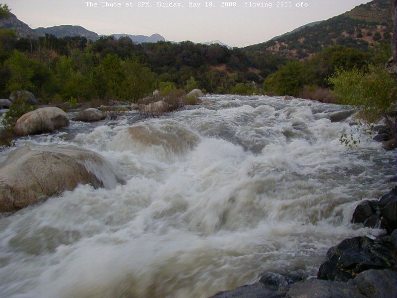 • 05-20-03 The Kaweah at Dinely Bridge was 1.7 ft at 8PM Mon 5-19-03 and 2.0 ft at 10 PM 2 hours later rising fast. The hole at the bottom of Osterizer is now very deep and ugly. Nearly impossible to miss without a very hard and quick right to left move at the right side of the black rock. Does not look good for rafts who can't make the right to left move. The cheat route for kayaks is also dicey with the strong currents and narrow slot.