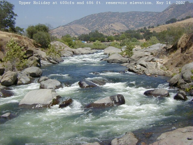• 06-05-03 It is speculated that the reason the lake is not filling this year is because of the work on the spillway at Terminus Dam and the Hwy 198 bridge at Horse Creek in preparation for the raising of the lake by 21 feet. The bad news is the future lake levels will bury both Upper and Lower Holiday rapids completely. The good news is the Holidays are runnable all this season for the first time in years.